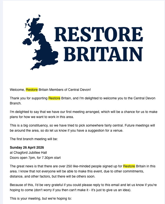 Restore Devon, Restore England, Restore Britain. 26th April 2026 Chagford Jubillee Hall